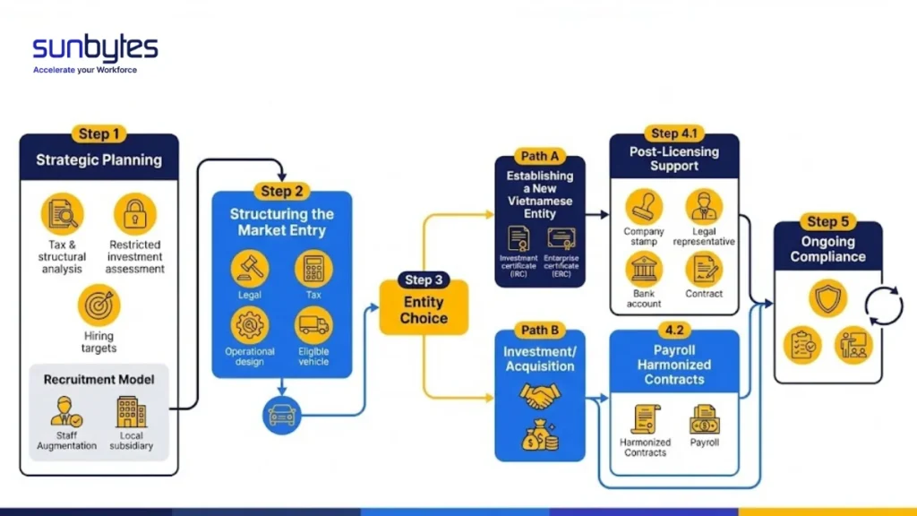 Ready to Scale Your Team in Vietnam? A key factor in successful market entry is turning intent into a delivery-ready workforce. By selecting the right entry strategy and partner, leaders can scale their operations securely and effectively in Vietnam. Sunbytes helps foreign investors understand their options, processes, and employer requirements, delivering on both the structural and practical aspects of recruitment in Vietnam.