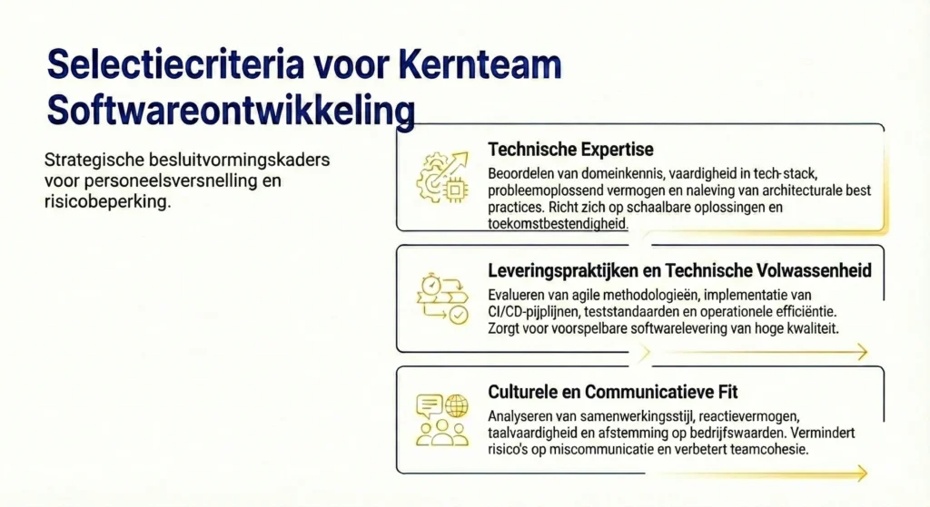 - De meest betrouwbare selectiecriteria combineren technische alignment, deliveryvolwassenheid, culturele fit en het vermogen om te schalen zonder architecturale controle te verliezen.